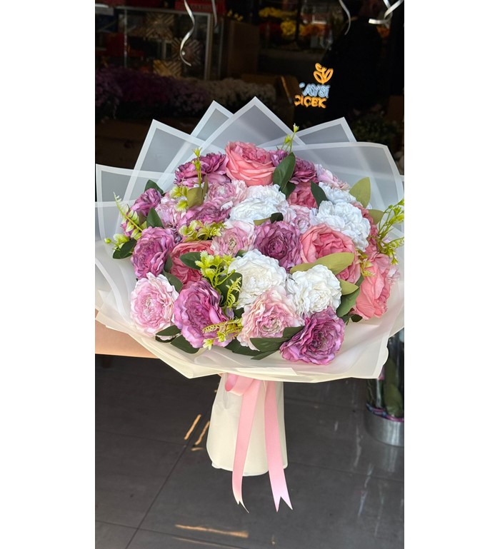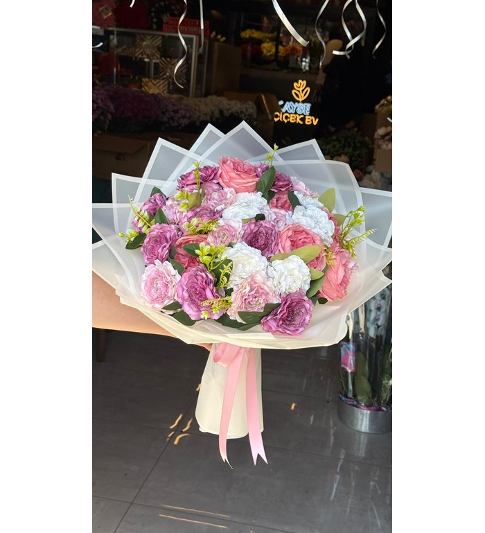 Önemli Not: Ürünlerimizde kullanılan yapay gül ve şakayıkların renk dağılımı ile paketlemede kullanılan ithal kağıtlar, stok durumuna göre küçük farklılıklar gösterebilir. Ancak her zaman 40 adet çiçek sayısına, seçilen renk konseptine ve buketin o görkemli duruşuna sadık kalınarak, el işçiliğiyle özenle hazırlanmaktadır.