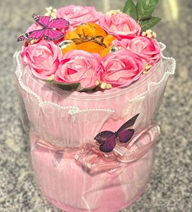 Şık silindir kutu içerisinde yer alan tüllerle süslenmiş yapay pembe güller ve zarif led detayları, bulunduğu ortama sıcak ve romantik bir atmosfer kazandırır.