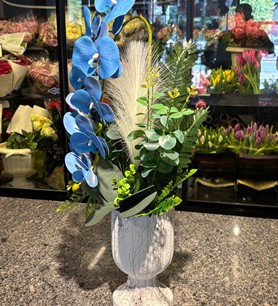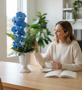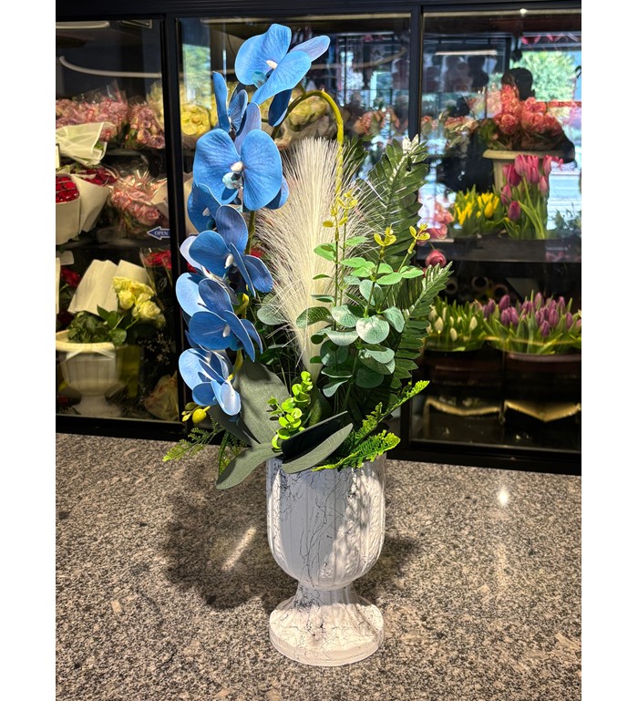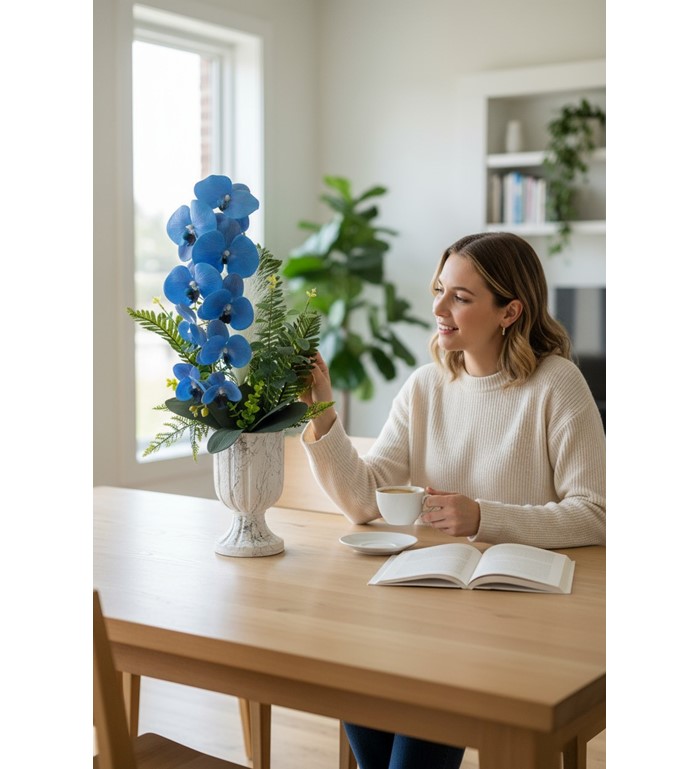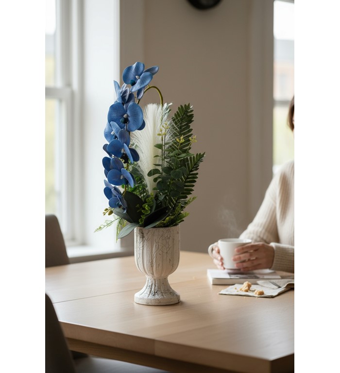 Ofis, salon, giriş alanı veya özel dekor köşelerinde uzun süre kalıcı bir şıklık sunan bu aranjman, bakım gerektirmeyen pratik yapısıyla zamansız bir dekoratif çözüm sunar. Gösterişli rengi ile dikkat çeken mavi orkide, aynı zamanda özel günlerde şık bir hediye seçeneğidir.